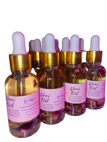 Our Sweet Signature Yoni Oil is infused with 100% organic ingredients that can increase moisture, reduce inflammation, and provide antibacterial and anti-fungal properties.